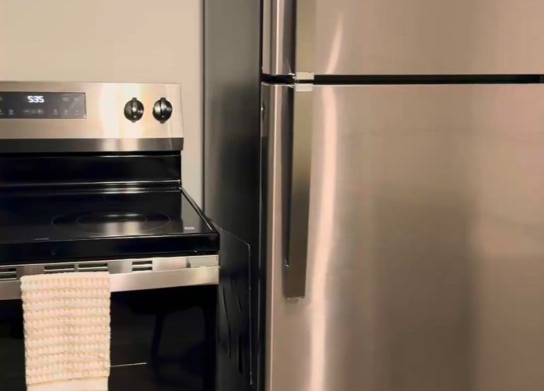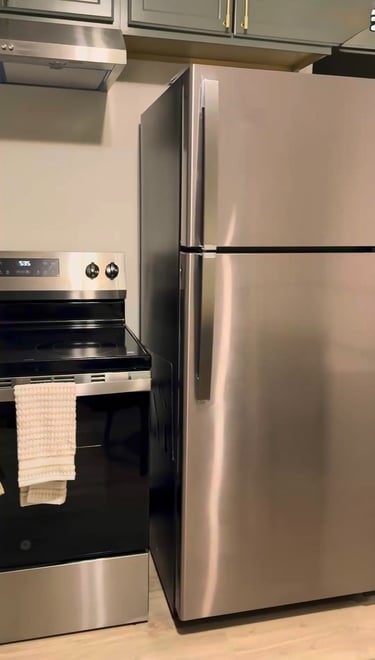 Full-size fridge, oven/stovetop, microwave, dishwasher
